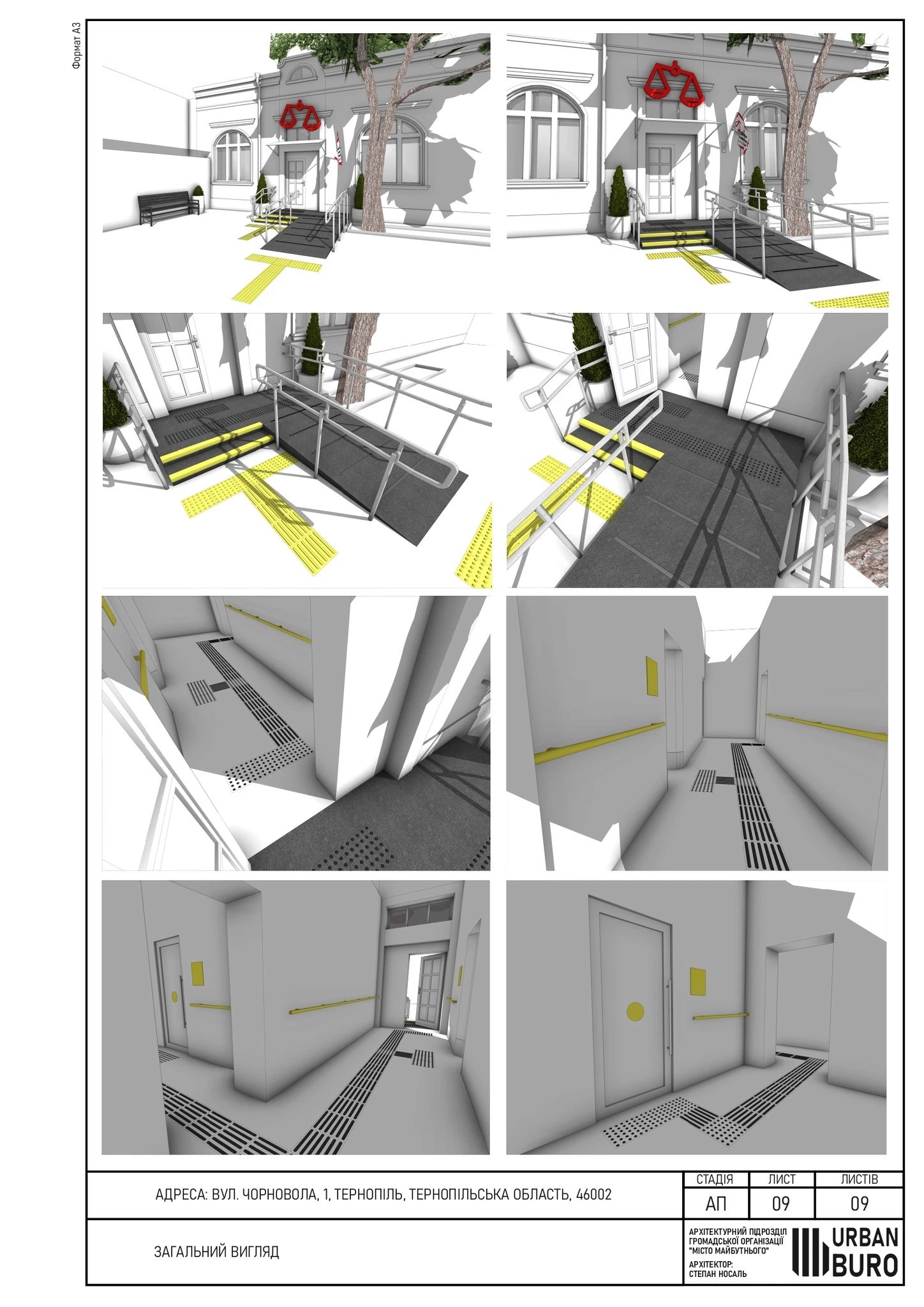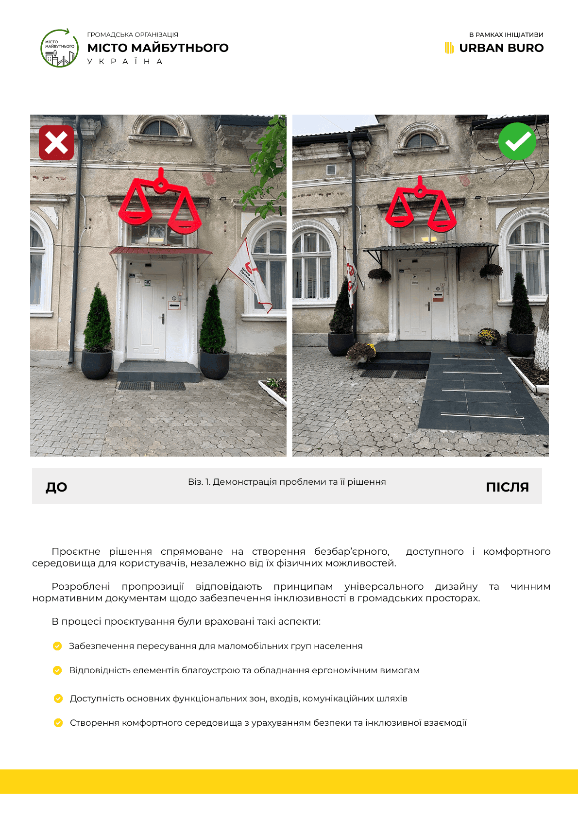 Архітектурні рішення передбачають адаптацію входу, приміщень загального користування та маршрутів переміщення відповідно до інклюзивних стандартів.